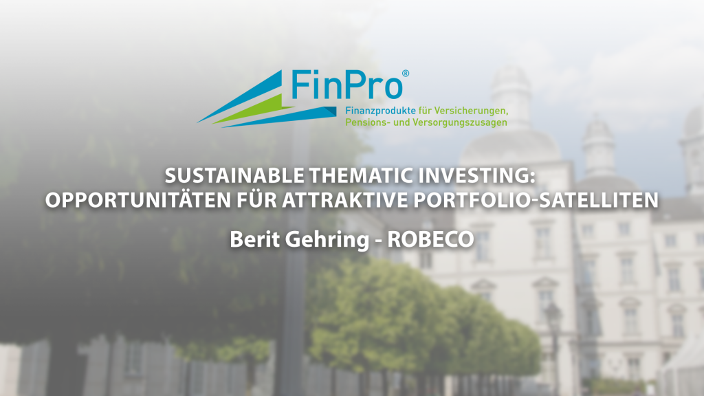 Der Vortragstitel von Berit Gehring auf der FinPro 2023: Sustainable Thematic Investing: Opportunitäten für attraktive Portfolio-Satelliten. Save the Date: FinPro 2024 am 18. und 19. Juni.